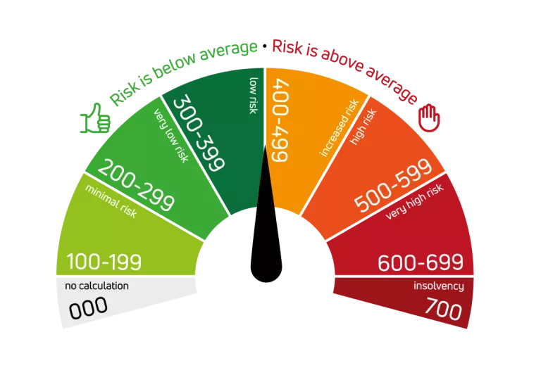 The KSV1870 Rating is divided into 7 levels. The higher the value, the greater the risk of insolvency. Values below 400 suggest an average to low risk. As the values reach 400 and above, the risk increases. At 700, the company is already insolvent.