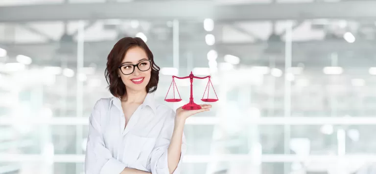 Frau mit Brille hält eine rote Waage in einem modernen Büro