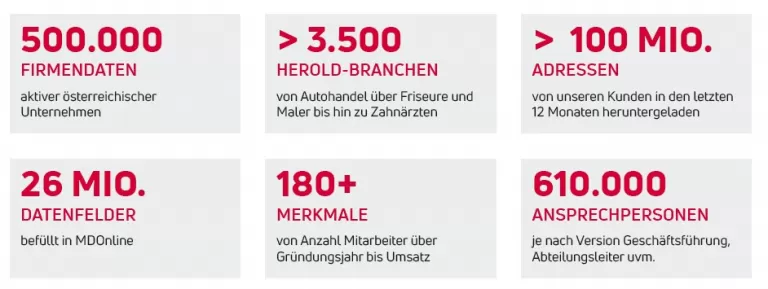Mit MDOnline haben Sie permanenten Zugriff auf wochenaktuelle Firmendaten. Sie können damit überall, wo ein Internetanschluss zur Verfügung steht, Abfragen erstellen, Daten downloaden und diese auch gleich für Ihre Direkt-Marketing-Aktivitäten weiterverarbeiten.