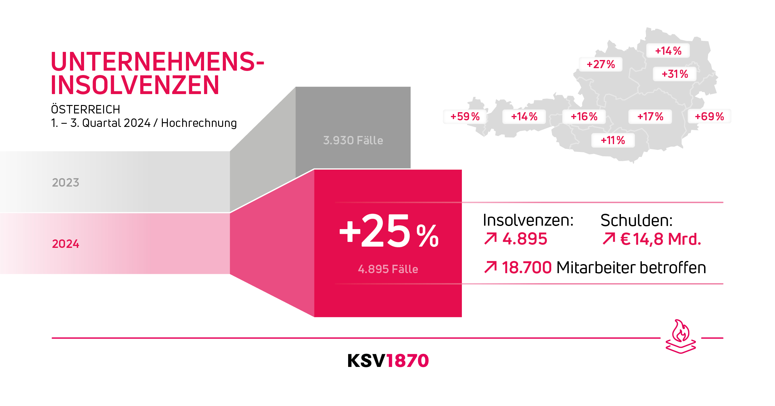 Wien, 24.09.2024 – Laut aktueller KSV1870 Hochrechnung wurden in den ersten drei Quartalen 2024 in Österreich 4.895 (+ 24,6 % gegenüber 2023) Unternehmen insolvent. Das sind durchschnittlich 18 Firmenpleiten pro Tag. Besonders betroffen sind einmal mehr der Handel, die Bauwirtschaft und die Beherbergung/Gastronomie. In Kombination mit einer Vielzahl an Großinsolvenzen – bereits jetzt gibt es 55 Großinsolvenzen mit jeweils mindestens über 10 Mio. Euro – sind auch die vorläufigen Passiva* auf rund 14,8 Mrd. Euro gestiegen. Das entspricht einem Zuwachs von 683 Prozent. Zudem sind die betroffenen Arbeitnehmer um knapp sechs Prozent auf 18.700 Personen und die Zahl der Gläubiger um circa 13 Prozent auf 36.800 Betroffene angewachsen. Aufgrund der aktuellen Insolvenzdynamik erwartet der KSV1870 am Jahresende in etwa 6.500 Firmenpleiten.