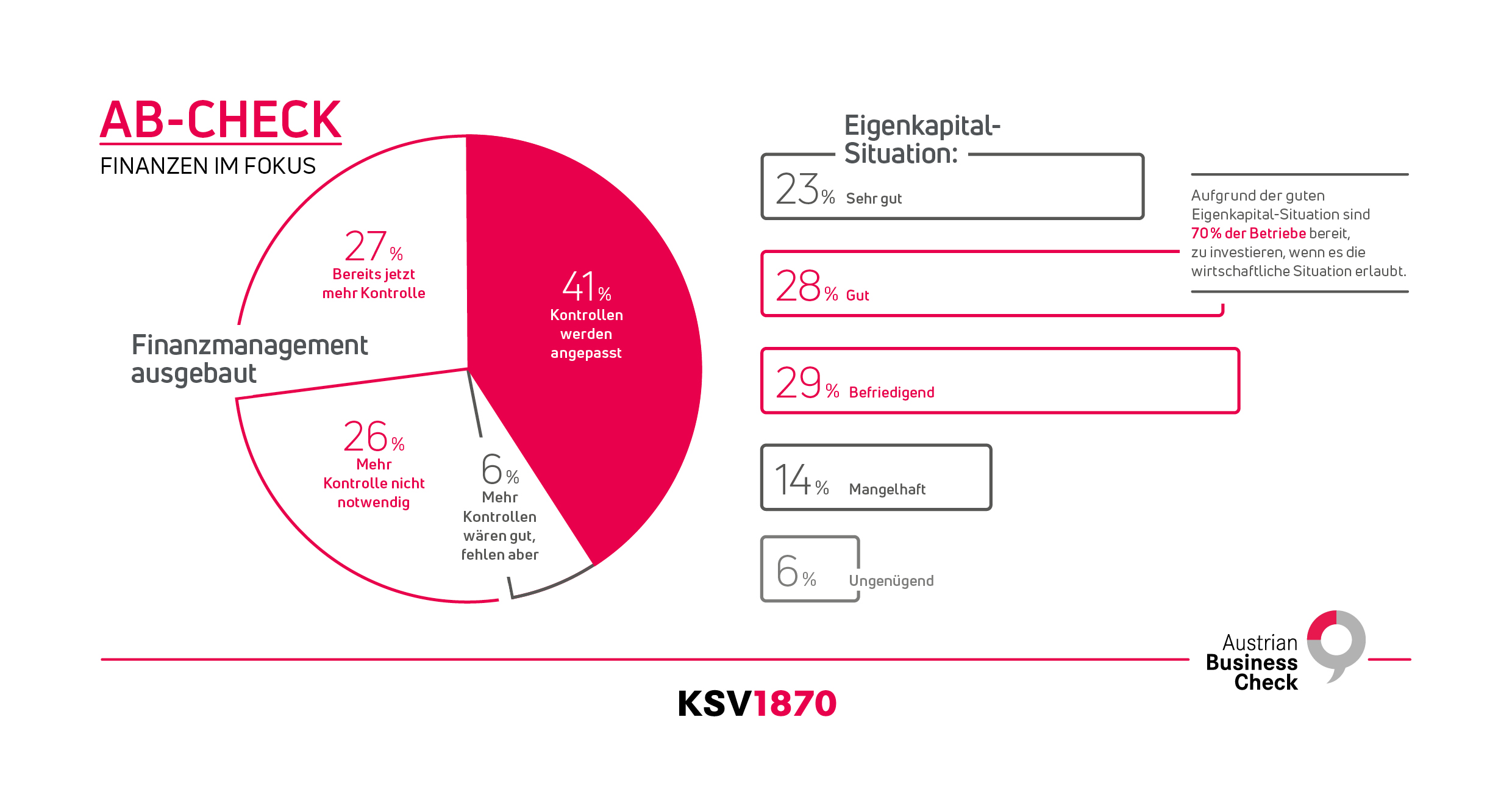 Wien, 26.04.2023 – Das Jahr 2023 steht im Zeichen eines knallharten Finanzmanagements. Laut Austrian Business Check-Umfrage haben 68 Prozent der Unternehmen zusätzliche Sicherheitsmaßnahmen installiert bzw. bestehende adaptiert, um die eigenen Finanzen besser zu kontrollieren. Weiters planen nur 12 Prozent der Firmen eine Kreditaufnahme, während im Vorjahr noch rund 26 Prozent der Betriebe einen Kredit aufgenommen haben. Die Unternehmen scheuen finanzielle Verbindlichkeiten aktuell wie selten zuvor. Zudem möchten 70 Prozent der Unternehmen im Jahr 2023 grundsätzlich Investments tätigen, viele machen sie aber von den wirtschaftlichen Entwicklungen in den kommenden Monaten abhängig. Überraschend: Jedes zweite Unternehmen ist mit der eigenen Eigenkapitalausstattung zufrieden. Die staatlichen Fördergelder dürften somit nicht nur zur wirtschaftlichen Bewältigung der Krisen genutzt worden sein, sondern auch ins Eigenkapital geflossen sein.