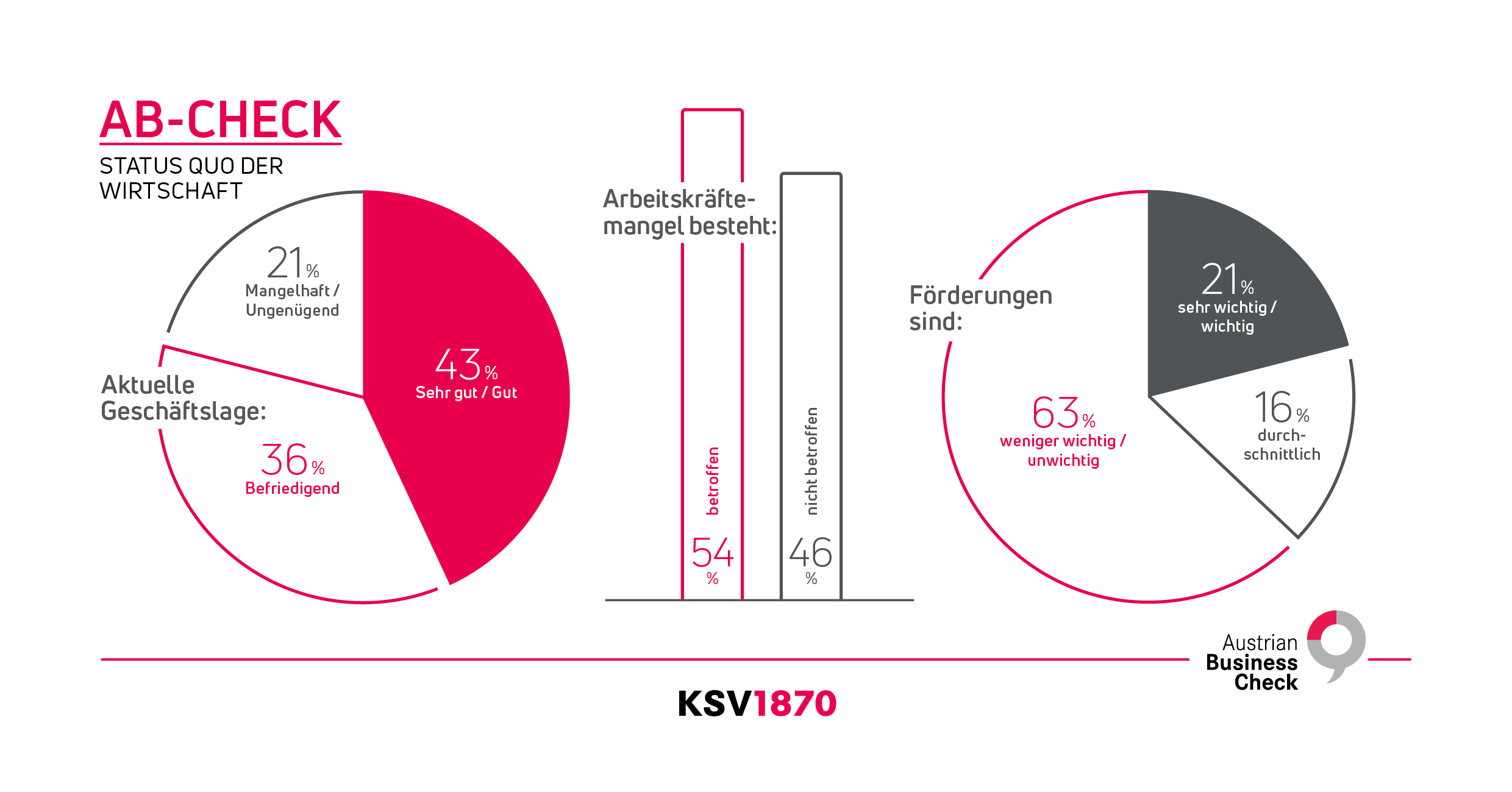 Die Lage am Arbeitsmarkt ist weiterhin angespannt und der Arbeitskräftemangel besteht unverändert. Daran hat sich in den vergangenen zwei Jahren nichts geändert. Laut Austrian Business Check klagen insgesamt 54 Prozent der Unternehmen (23 % sind sehr betroffen) über fehlendes Personal – speziell die Gastronomie (85 %), die Bauwirtschaft (65 %) und das Gesundheits-/Sozialwesen (60 %). Die Auswirkungen auf die Unternehmen sind enorm: Steigende Kosten, um Mitarbeiter zu halten, hohe Zusatzbelastungen (inkl. gesundheitlicher Folgen) für bestehendes Personal und Umsatzeinbußen aufgrund nicht mehr zu erfüllender Aufträge sind die Folgen. Hinzu kommt eine generell steigende Unzufriedenheit bei Mitarbeitern und Kunden. Und dennoch: Aufgrund der finanziellen Einschränkungen besetzen sieben von zehn Betrieben gar nicht oder nur absolut notwendige Stellen nach. „Ein Großteil der Unternehmen steht beim Thema Nachbesetzung massiv auf der Bremse. Für sie ist es ein schmaler Grat zwischen fehlendem Personal und dem Verlust der Wettbewerbsfähigkeit“, erläutert Vybiral.