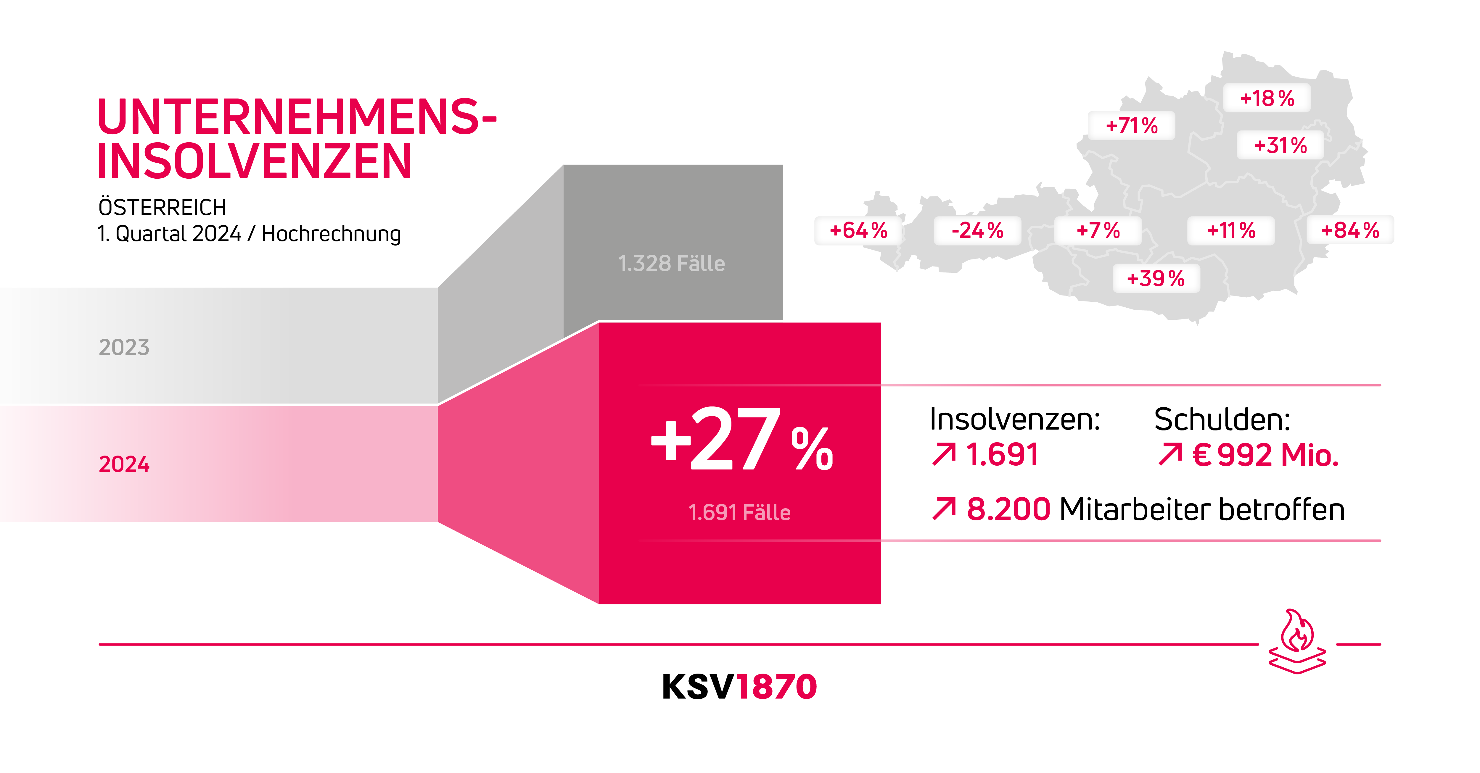 20.03.2024 – Laut aktueller KSV1870 Hochrechnung wurden im ersten Quartal 2024 in Österreich 1.691 (+ 27,3 % gegenüber 2023) Unternehmensinsolvenzen gezählt. Das entspricht rund 19 Firmenpleiten pro Tag. Besonders betroffen sind vor allem die Branchen Bau, Handel und Beherbergung/Gastronomie. Aufgrund mehrerer Großinsolvenzen von jeweils über 10 Mio. Euro haben sich die vorläufigen Passiva* um 146,2 Prozent auf 992 Mio. Euro erhöht. Parallel zu den steigenden Insolvenzen hat sich zudem die Anzahl der betroffenen Mitarbeiter auf 8.200 Personen verdoppelt, und jene der Gläubiger um 37,6 Prozent auf 12.800 Betroffene erhöht. Für das Jahr 2024 erwartet der KSV1870 aus heutiger Sicht zumindest 6.200 Firmenpleiten.