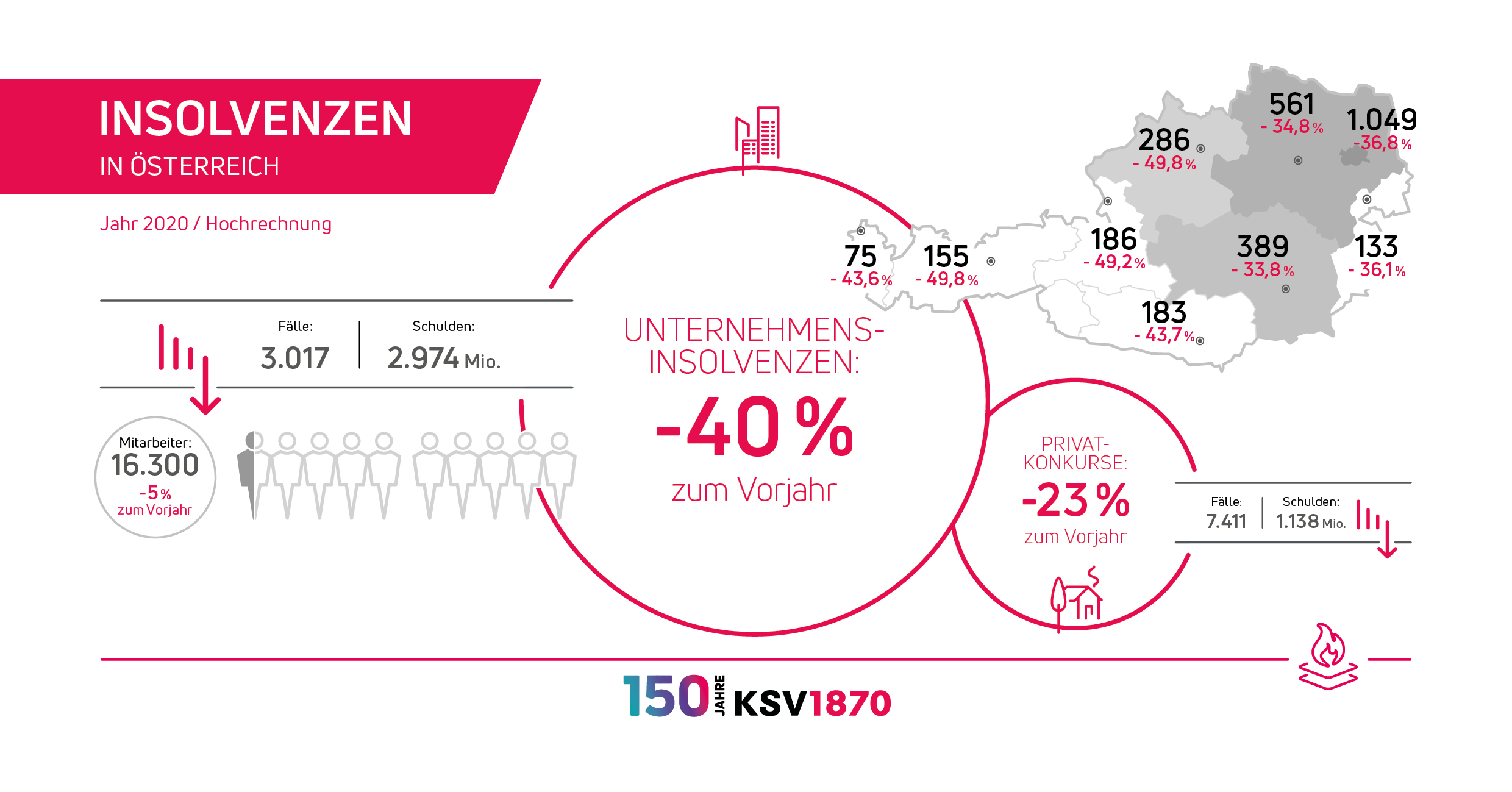 Wien, 16.12.2020 – Die privaten Schuldenregulierungsverfahren (Privatkonkurse) sind auf das ganze Jahr 2020 hochgerechnet um 22,7 % auf 7.411 eröffnete Fälle gesunken. Es wurden dabei Verbindlichkeiten in der Höhe von rund 1,1 Mrd. Euro einer Regulierung zugeführt. Somit ergibt sich ein Schuldendurchschnitt von rund EUR 150.000, wie bereits auch schon im Vorjahr.
