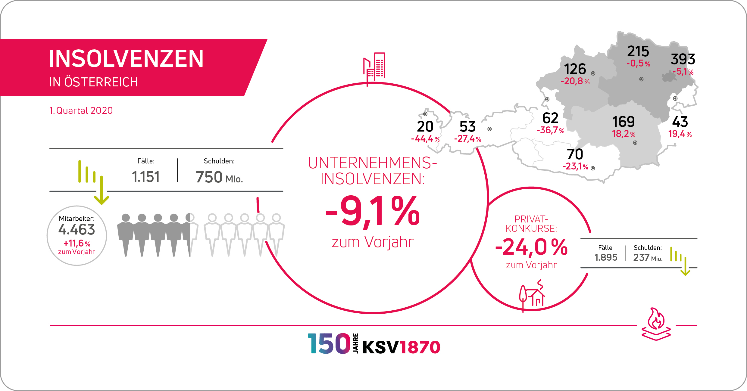 Wien, 06.04.2020 – Im ersten Quartal 2020 sind die Insolvenzzahlen in Österreich deutlich rückläufig. Insgesamt wurden 1.151 Unternehmen insolvent, was einen Rückgang von rund 9 % gegenüber dem ersten Quartal 2019 darstellt. Es wurden 668 Insolvenzverfahren eröffnet und das stellt einen Rückgang von fast 14 % dar. Die Passiva allerdings haben sich in diesem Zeitraum auf EUR 750 Millionen fast verdoppelt. Die Zahl der betroffenen Dienstnehmer betrug 4.463 und lag damit um rund 12 % über dem Wert des Vergleichszeitraums 2019.