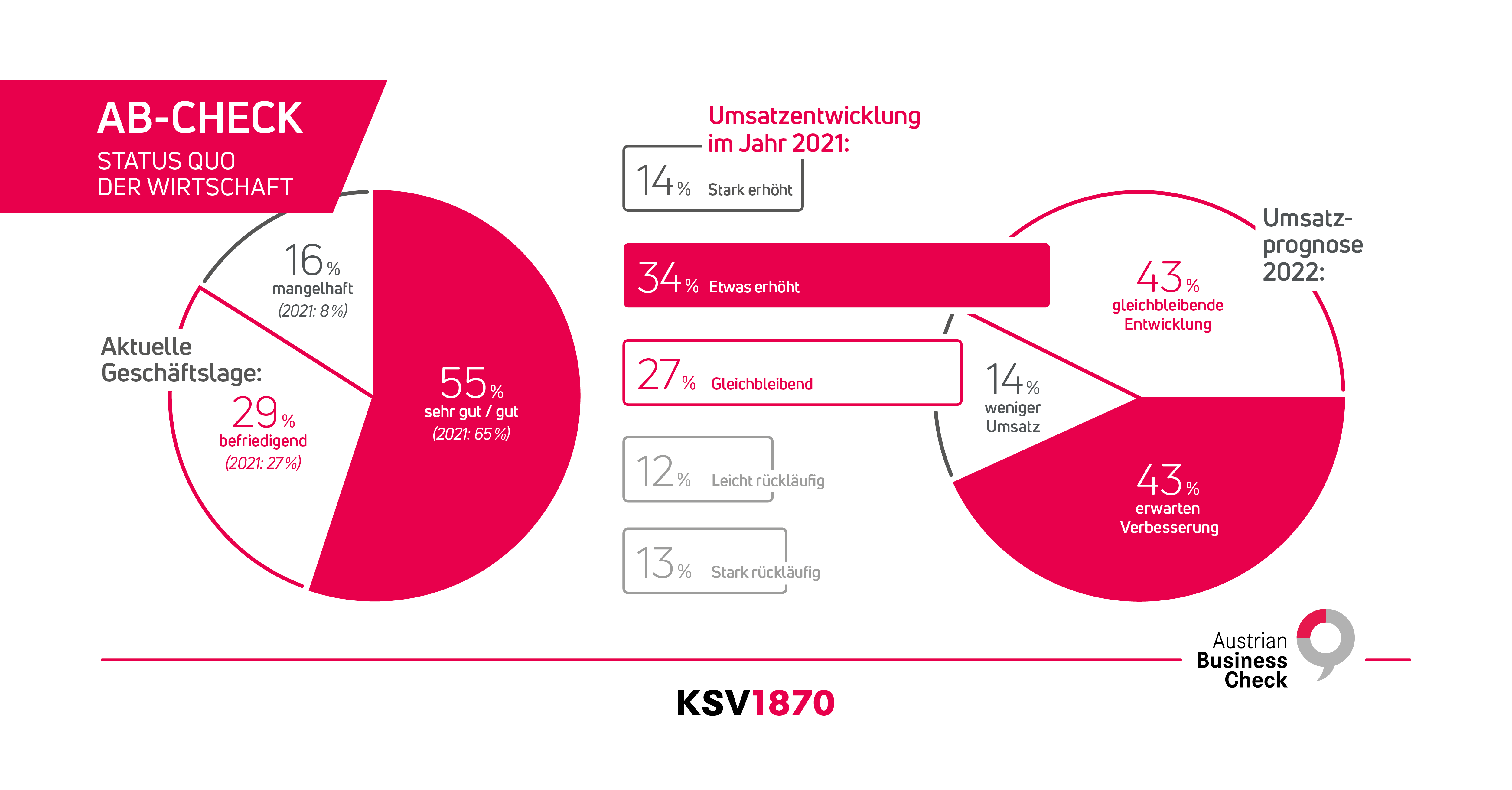 Zur Umfrage: Im Rahmen des Austrian Business Check befragt der KSV1870 zweimal pro Jahr Österreichs Unternehmen, wie es um ihre wirtschaftliche Situation bestellt ist. An der aktuellen Umfrage im März 2022, die gemeinsam mit dem Markt- und Meinungsforschungsinstitut Marketagent durchgeführt wurde, haben sich mehr als 1.300 heimische Unternehmen beteiligt.