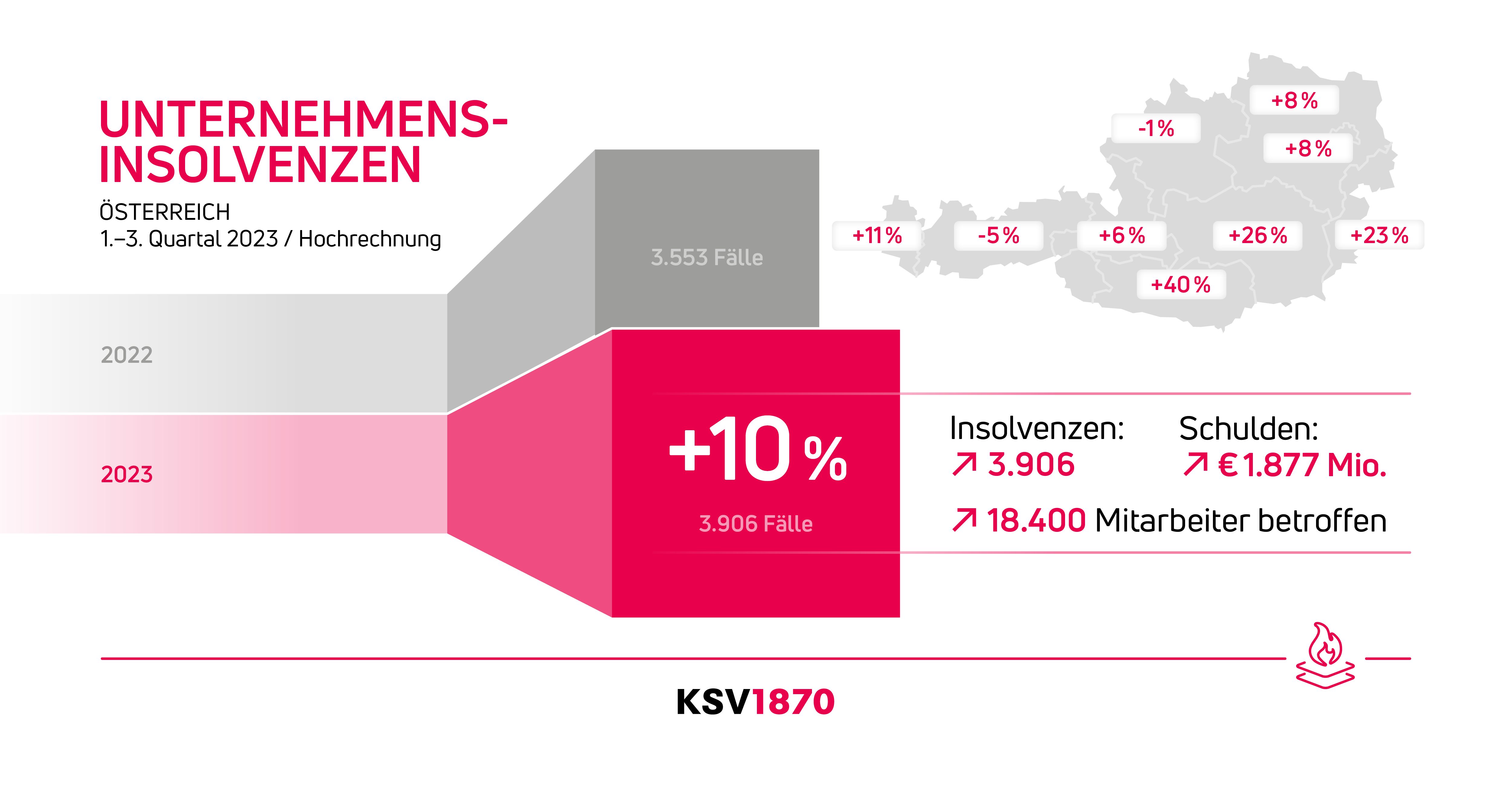 Wien, 20.09.2023 – Laut aktueller KSV1870 Hochrechnung sind in den ersten drei Quartalen 2023 in Österreich 3.906 Unternehmen (+ 9,9 % gegenüber 2022) von einer Insolvenz betroffen. Den deutlichsten Zuwachs verzeichnet Kärnten (+ 39,5 %), den größten Rückgang vermeldet Tirol (- 5,0 %). Weiters haben sich die vorläufigen Passiva* um 24,6 Prozent auf 1,88 Mrd. Euro erhöht. Darüber hinaus gerät die Bauwirtschaft immer mehr unter Druck: denn während sich der Handel bereits seit längerer Zeit in der Krise befindet, verdichten sich nun die Gewitterwolken über der Baubranche zunehmend. Mit Blickrichtung Jahresende werden in Österreich insgesamt bis zu 5.300 Firmenpleiten erwartet.