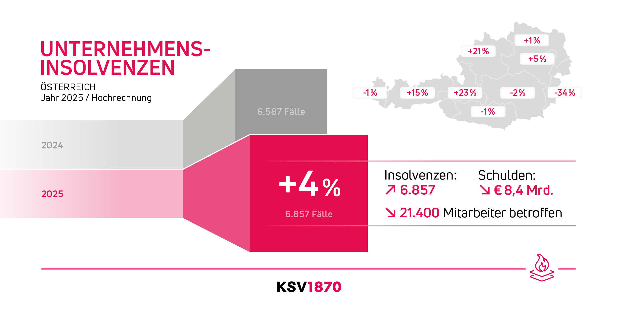 Wien, 11.12.2025 – Laut aktueller KSV1870 Hochrechnung mussten im Jahr 2025 in Österreich 6.857 Unternehmen (+ 4,1 %) Insolvenz anmelden. Trotz dieses Anstiegs sind die vorläufigen Passiva* im Vergleich zum Vorjahr um 55,8 Prozent auf circa 8,38 Mrd. Euro gesunken. Ausschlaggebend dafür ist die im Jahr 2025 deutlich niedrigere Anzahl an Insolvenzen mit Passiva von mehr als 200 Mio. Euro. Die größte Pleite des Jahres betrifft jene der SIGNA Prime Capital Invest GmbH (Passiva: 870 Mio. Euro). Darüber hinaus ist gegenüber dem vergangenen Jahr die Zahl der betroffenen Mitarbeiter (21.400) um 27,7 Prozent gesunken. Einen Anstieg gibt es aufseiten der betroffenen Gläubiger (54.400) mit einem Plus von 8,2 Prozent. Für das Jahr 2026 prognostiziert der KSV1870 ein ähnliches Insolvenzaufkommen wie in diesem Jahr, sofern sich an den wirtschaftlichen Rahmenbedingungen nicht gravierend etwas ändert.