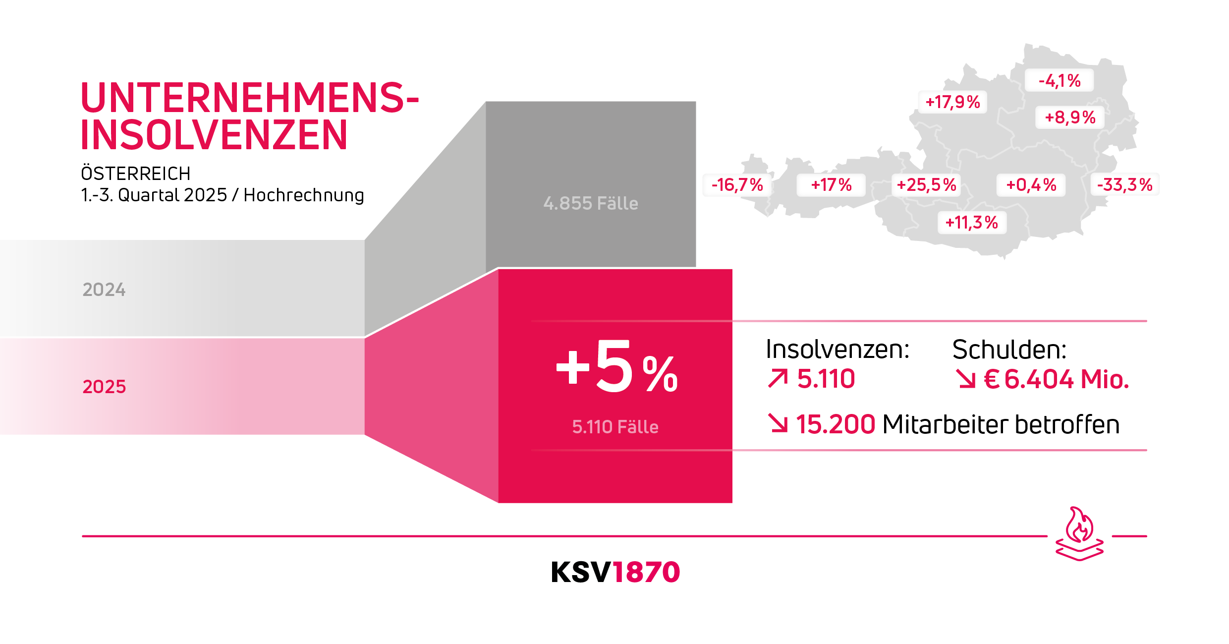 Die Gefahr eines dritten Rezessionsjahres infolge ist in Österreich weiterhin nicht gebannt, die heimischen Unternehmen stehen unverändert unter großem finanziellen Druck. Zwar gab es zuletzt zaghafte Anzeichen einer leichten Stabilisierung der wirtschaftlichen Lage, diese reichen jedoch bei weitem nicht aus, um die Insolvenzwelle einzudämmen. Demzufolge ist die Zahl der Unternehmensinsolvenzen zum Ende des dritten Quartals 2025 gegenüber dem Vorjahr um 5,3 Prozent auf insgesamt 5.110 Firmenpleiten gestiegen. „Neben dem insgesamt hohen Kostenniveau hat auch die vielerorts maximal durchschnittliche Auftragslage und damit einhergehend fehlende Umsätze zu einem Anstieg der Insolvenzen geführt“, analysiert MMag. Karl-Heinz Götze, MBA, Leiter KSV1870 Insolvenz, die Ursachen. „Der Personalmangel trägt auch seinen Teil dazu bei, dass viele Unternehmen Aufträge ablehnen müssen und damit Geld liegen bleibt“, so Götze weiter.