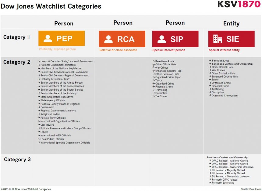 Darüber hinaus enthält der ComplianceCheck Informationen zu Sanktionen, Wirtschaftsbetrug, Finanz- und Steuerdelikten, Terror und Korruption. Diese werden als Special Interest Person (SIP), bzw. Special Interest Entity, also Unternehmen, Organisationen oder Einrichtungen (SIE) gekennzeichnet.