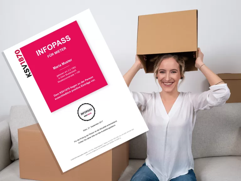 Der InfoPass für Mieter kann ausschließlich vom Mietinteressenten selbst über diese Website direkt online bestellt werden. Der Mieter wird Schritt für Schritt durch die Bestellung geleitet. Es ist ein amtlicher Lichtbildausweis hochzuladen. Die Bezahlung erfolgt mit Kreditkarte, PayPal, eps oder Paysafecard. Der InfoPass wird innerhalb von 3 Werktagen als PDF-Download per E-Mail zugestellt.